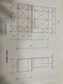 Nella parte opposta si trova un mobile armadio che contiene nella parte alta 2 antine piccole e 2 ante grandi con relativi ripiani. Nella parte bassa il mobile è costituto da 2 ante grandi con relativo ripiano, 2 antine medie con ripiani e 2 cassetti piccoli e 1 cassetto grande.
