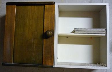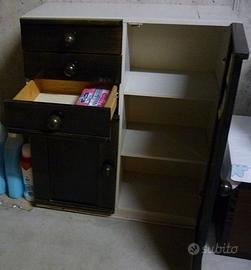 Mobile bagno in legno scuro e interno in laminato bianco composto di base con 3 cassetti e due ante - dimensioni 72cm x 37cm x altezza 84 cm e appeso con anta e parte a giorno dimensioni 72cm x 22cm x altezza 45 cm
