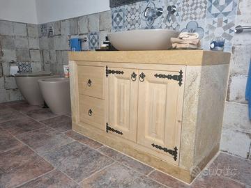 Mobile bagno in tufo di Marsala naturale firmato Artigiantufo, realizzato in stile siciliano con dettagli in ferro battuto e legno chiaro. Un pezzo autentico che unisce tradizione e artigianato locale. Disponibile anche su misura, per adattarsi perfettamente a ogni ambiente.