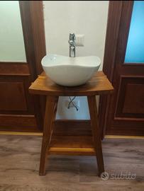 Mobile bagno in legno massello completo con lavabo e rubinetto.