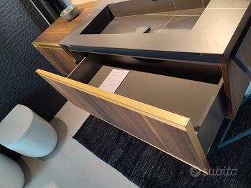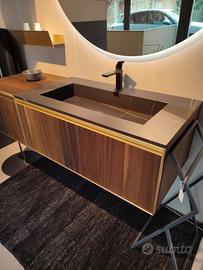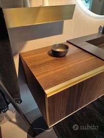 In abbinamento, specchiera tonda d.120 retroilluminata ad euro 414 iva compresa, e mensola (in questo caso oro spazzolato ma che puo' essere in finitura diversa come la maniglia del mobile) lunga 85 cm con asola per portasalviette ad euro 279 iva compresa.