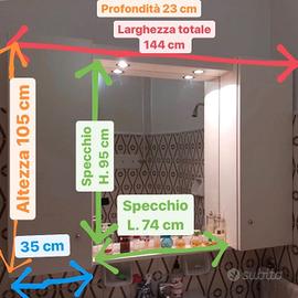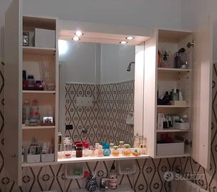 Elegante Mobile per il bagno realizzato artigianalmente e contenitore. Colore: laccato bianco con eleganti pomelli color argento. Possiede: • 2 faretti incassati e interruttore di accensione integrato • ampio specchio (larghezza 74 cm, altezza 95 cm) • mensola per esporre ad esempio profumi, creme, ecc. • 2 ante a 8 scomparti, 4 per lato (larghezza scomparto 30 cm, altezza regolabile, profondità 18 cm). In ottime condizioni e tenuto con molta cura! Ritiro a Padova