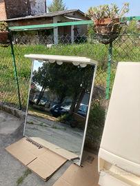 Mobile arredo bagno a basamento laccato bianco, con base marmo "Portogallo" spessore 3cm, specchio H114/L96.5 e contenitore laterale, ben tenuto. Fornito di lavandino incorporato e miscelatore monoforo con attacchi acqua.