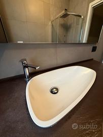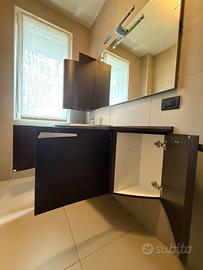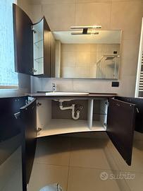 Mobile bagno marca ardeco modello kenzia larice moka, larghezza 145 cm, profondità varia tra 60 e 25 cm. Piano in quarzo. Lavabo semi incasso. Pensile sospeso larghezza 25 cm. Specchio 140 x 80 cm con profilo in alluminio e faretto. No spedizione.