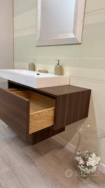 Mobile bagno in foglia di noce e listellare di castano con vasca bianca.
