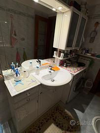 Vendo mobile bagno Edmo, colore bianco laccato con vano porta lavatrice, top in marmo di Carrara, comprensivo di specchio con luci a led e pensile. Misure larghezza 175 cm (profondità 53 e 35 cm), specchio 105x100 cm, pensile con antine in vetro larghezza 70 cm. Porte mobile lavatrice attualmente non montate