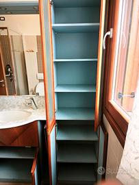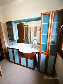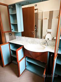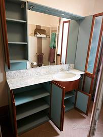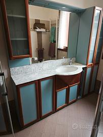 Mobile bagno di ampia dimensione (lunghezza 198 cm, altezza 198 cm profondità 18,5/35/53 nel punto del lavandino), realizzato in struttura impiallacciata ciliegio con finitura laccata opaca azzurro.