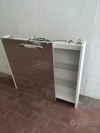 Mobiletto per bagno di buona qualità, specchio scorrevole per accedere ai ripiani in cristallo, lampada centrale e presa con interruttore in alto a dx, le misure sono Larghezza 95cm Altezza 80cm profondo 15cm