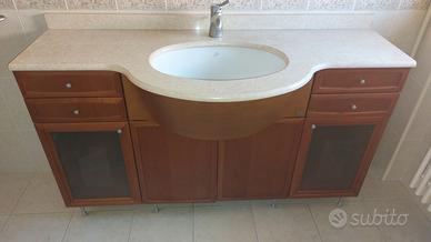 mobile bagno in ciliegio marca IDEA con piano in marmo e relativo miscelatore color argento satinato (come in foto) e piletta. Lunghezza totale 140 cm., massima sporgenza in corrispondenza del lavandino a incasso 59 cm.