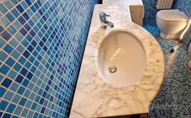 mobile bagno blu laccato opaco compreso di top in marmo di Carrara, lavandino e miscelatore.Misure: lunghezza 103 cm, larghezza minima 35 e massima 51 cm. Altezza da terra 84 cm. Profondità utilizzabile mobile posto sotto il lavello 34 cm. Trasporto ed eventuale smontaggio a carico acquirente.