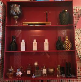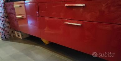 A causa di una ristrutturazione immediata dell’abitazione, sono costretta a vendere mobile bagno in ottime condizioni. Il bagno è legno verniciato lucido caratterizzato da una raffinata finitura rosso pompeiano, colore caldo e senza tempo, elegante e di forte impatto estetico Acquistato presso Peduzzi, storico negozio di arredobagno di Sesto San Giovanni (MI). Da tempo non è stato utilizzato, come visibile dalle foto allegate, che ne attestano l’eccellente conservazione. Disponibile da subito per ritiro a carico dell’acquirente. Prezzo trattabile. Per informazioni o ulteriori foto, contattatemi in privato senza impegno. Mobile sospeso da terra: -Lunghezza: cm. 180.5 -Profondità: cm. 60.5 -Altezza: 48 cm. -Dotato di 4 cassetti lunghezza 90 cm. Credenza con mensole a giorno: -Lunghezza: 80 cm -Profondità: 17.5 cm -Altezza: 90 cm. Specchio rotondo: -Diametro: 109,5 Lavabo sosteso: -Diametro: 58 cm.