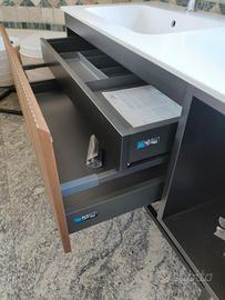 mobile bagno sospeso composto da 1 cassettone da 90 con cassetto interno, base a giorno, lavabo in solid surface bianco opaco con lavabo integrato sx. Struttura laccato nero e frontale cassetto in legno tinto noce cannettato. dimensioni del mobile L. 120 P. 51 H. 46.