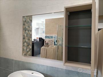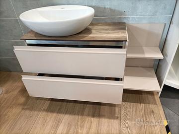 L'articolo comprende : mobile da bagno sospeso con doppio cassetto, elemento laterale con 2 vani a giorno, lavabo, specchiera con pensile a ripiani .