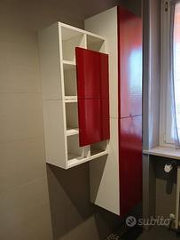 vendo mobile bagno bianco e rosso scuro composto da mobile cn lavabo con cassettone larghezza 1 mt profondo 48 cm è alto 45,5 cm e colonne come da foto, colonna più alta formata da due blocchi larghi 34 cm profondi 35 cm e alti 80 cm l'uno, colonna semi aperta formata da due blocchi larghi 45 cm profondi 23 cm è alti 45 cm. Vendo x cambio casa, presenta sl una riga lieve su un anta della colonna più alta. Smontaggio e trasporto a carico dell'acquirente.