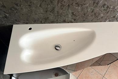 Mobile bagno sospeso marca NOVELLO, con due cassettini laterali, un cassettone più 1 cassetto interno. Top bianco opaco con vasca a forma di cuore, senza troppo pieno. Colore nero lucido.