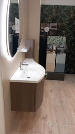 Mobile da esposizione cm 185,5x 50,8/20,8 in melaminico legno corvara con top in mineralguss con lavabo integrato, specchio stone con luce led perimetrale e faretto, mensola in alluminio laccata bianco, colonna h99
