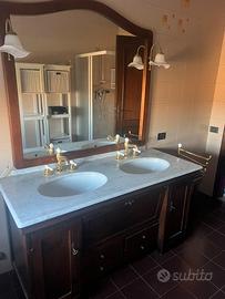Mobile bagno in legno massello, top in marmo bianco di Carrara con doppio lavello e rubinetteria in ottone. Specchio con doppia lampada a fiore. Prezzo trattabile.