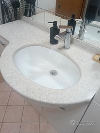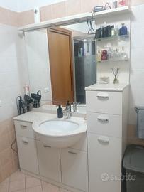 Mobile bagno composto da lavandino, colonna laterale con 2 cassetti e 1 anta, sotto lavabo con 2 ante, laterale con 1 anta e1 cassetto, top superiore e specchiera con mensola porta faretti. misure max, larghezza 140 cm, altezza 200 cm e profondità 60 cm. presenta qualche segno di vita vissuta, ma nel complesso è ancora accettabile.