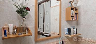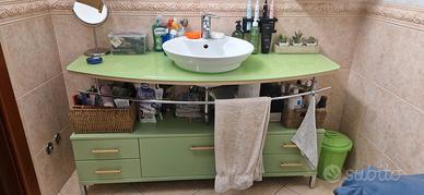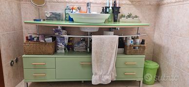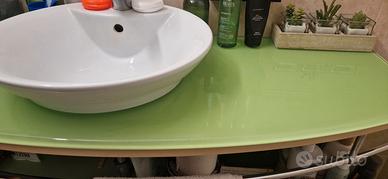 Mobile bagno completo come in foto, con piano in cristallo verde sospeso lunghezza 142,5 cm, lavandino in appoggio e base in cassettoni staccata e quindi posizionabile dove si vuole.