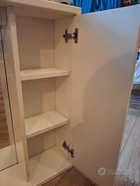 vendo mobile pensile del bagno in legno (truciolato) bianco, in ottime condizioni (edi foto). è composto di due sportelli laterali con tre ripiani, comodo per ordinare le cose. Cavo elettrico funzionante per luce sopra specchio. misure 105x74x18cm