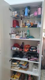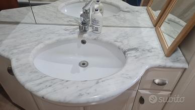 mobile lavandino con specchiera e mobile laterale. colore bianco opaco e accessori color argento.