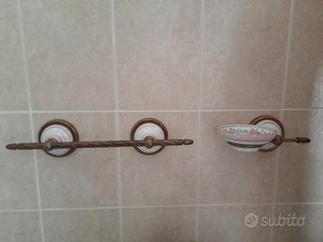 mobile bagno in legno, piano in marmo , specchio con applique, rubinetteria, accessori bagno in ferro e ceramica in perfette condizioni , portarotolo portasalviette da viso e bidet, portaspazzolini, portasapone e gancio per accappatoi. Misura del mobile lungh. 125 cm, altezza 82 cm., larghezza massima 57 cm, minima (angoli) 35 cm., specchio 96 × 112 cm.