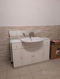 Parte inferiore con sportelli e due piccoli cassetti, parte superiore con specchio e luci (funzionanti) e altro vano con sportello. Piano in marmo e lavabo in ceramica.