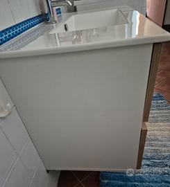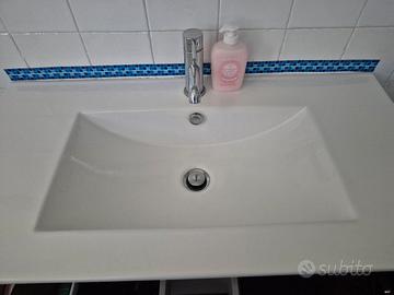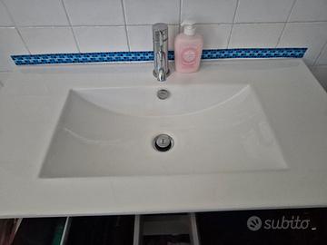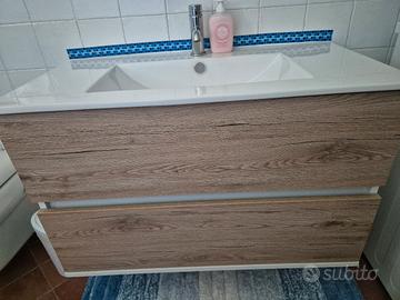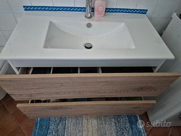 Mobile sospeso bagno con lavabo in ceramica e due cassettoni, in ottime condizioni. Misure: 92Lx47Px58H Venduto senza miscelatore. Se interessati, regalo specchio 80x60 cm con attacchi, nuovo, ancora nella sua scatola originale. Trasporto a carico dell'acquirente.