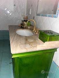 Mobile bagno realizzato su misura in legno massello color verde, piano in marmo e lavabo ad incasso con cassettini ai lati del lavabo.