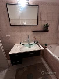 Mobile bagno buono stato come da foto completo di specchio e lavabo, piccola scheggiatura sul lavabo. Misure 92x50 parte sopra, sotto (parte marrone) 90x50.