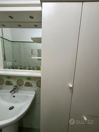 Mobile bagno completamente in legno. Ripiani e porta biancheria sporca. Mobile usato, con pomello mancante, ma ben tenuto.
