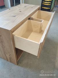 Mobile bagno costruito in massello di rovere RUSTICO 2°qualità costruito a 3 strati con qualche crepo e spaccatura con misura lungh.120 prof 50 h 80 composto da 1 cassettone centrale che scorreranno su guide ammortizzate e interno in betulla 16 mm con fondo da 6 mm, apertura tramite fresata a gola a spizza sopra il cassetto a 45°, costruito tutta la struttura e i frontali a 3 strati in modo che non si incurvino nel tempo con interno in multistrato di pioppo e ricoperto di essenza di rovere massello da 7 mm tutto con spessore finito 3 cm, unione del tutto a 45° parte superiore e sotto dritta con il fondo, sotto rialzato di 5 cm il ripiano fisso con pannello chiuso in modo che sia lo spazio per passare con i piedi ma la polvere non vada fino dietro il mobile, schienale traforato per passaggio tubi da 8 mm con foro per miscelatore e sifon. finitura con effetto grezzo naturale trasparente in modo che acqua non entri sul legno. ESCLUSO LAVELLO MISCELATORE e SIFON. è stato costruito su commissione ed esigenze del cliente, non è disponibile a magazzino ma essendo i diretti produttori falegnami possiamo riprodurlo uguale o in base alle proprie esigenze. per domande o dubbi contattateci P.S. disponibili a dare suggerimenti o chiarimenti in merito, per noi conta dare vita al vostro sogno DIRETTAMENTE DAL PRODUTTORE ASTENERSI RIVENDITORI O COMMERCIANTI