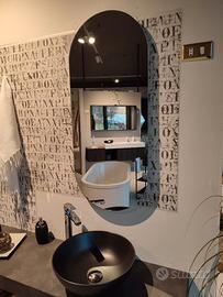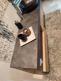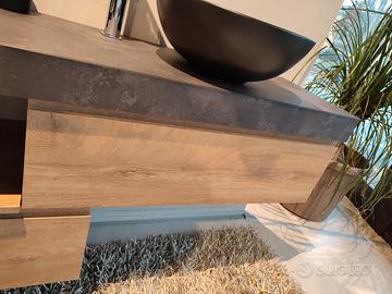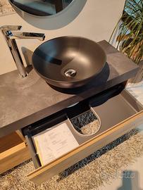 Se avete poco spazio in profondita', consigliamo l'utilizzo di mobili in profondita' ridotta come questo con apertura a gola due cassetti l.85 h.25 p.37 finitura kiki finto legno, con top in hpl stratificato finitura metal l.155 p.37 h.8 e relative staffe di supporto, con lavabo a ciotola nero opaco.