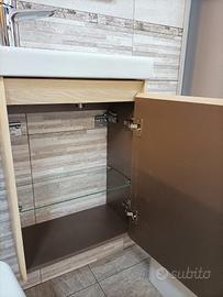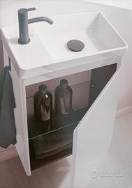 Mobile bagno salvaspazio profondità cm. 27,5, mai usato e stato solo in esposizione. Colore rovere come foto oppure bianco . Si vende a metà prezzo, corredato di lavandino, specchio e mensola in vetro. No rubinetto e luce.
