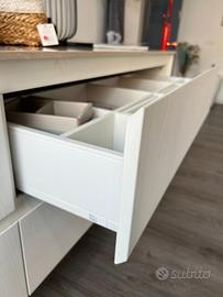 Bagno senza maniglie, in legno chiaro impiallacciato con top in quarzo e vasca in appoggio, comprensivo di specchiera illuminata e pensili contenitivi.
