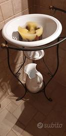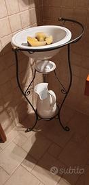 Mobile porta asciugamani da bagno in ferro battuto con brocca e bacinella in ceramica.