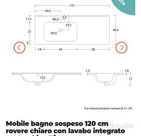 Mobile bagno sospeso 120 cm rovere chiaro in legno MDF con lavabo integrato si rivende per SBAGLIO MISURE