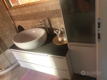 Vendo causa inutilizzo post ristrutturazione mobile sospeso completo di cassettiera (due grandi e due piccoli) e colonna a muro con tre mensole nel ripiani superiore e due piano inferiore piu top in marmo marrone. No lavabo e miscelatore. Per info misure contattatemi in privato!