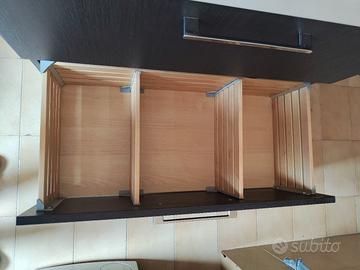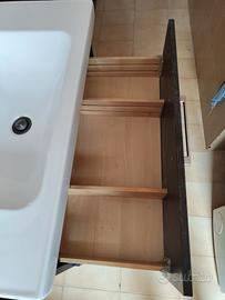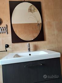 Mobile bagno sospeso colore nero wengè, completo di lavabo in ottimo stato e rubinetteria. Piccoli segni di usura visibili in foto solo sul mobile. Inclusi anche divisori interni ai cassettoni. In più regalo lo specchio che si può appendere sia verticalmente (come in foto) che orizzontalmente. Misure intero mobile: H 64 Prof 48 Larghezza 80 Misure intero lavabo: Larghezza 53 Prof. 48 Misure lavabo interno: Larghezza 53 Prof. 32 2 cassetti misure l'uno H 28 Prof.37 Misure specchio in verticale: Larghezza 70 H 90 Prof 2 cm Smontaggio e trasporto a carico dell' acquirente, zona La Rustica. (RM)