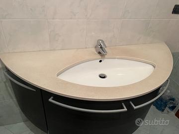 Mobile bagno sospeso, legno e top in pietra beige. Misura 143 cm in larghezza, 52 cm in altezza e 56 cm di profondità. Solo ritiro da parte dell’acquirente.