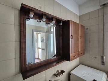 Mobile da bagno composto da ampio specchio con illuminazione integrata e pensile laterale con ante e ripiani interni. Struttura in legno con finitura color noce/caldo, stile classico-moderno. Caratteristiche: Specchio grande con luci superiori funzionanti Pensile laterale con 2 ante + 2 cassetti inferiori Ripiani interni spaziosi e regolabili Mensola sotto lo specchio utile per appoggio Condizioni: Buone condizioni generali, segni di normale utilizzo (come da foto), struttura solida. Ideale per: Secondo bagno, casa vacanze, ristrutturazioni economiche o chi cerca un mobile funzionale a basso costo. Ritiro e smontaggio a carico dell'acquirente,cortile interno comodo per carico. Per ulteriori informazioni scrivimi in privato