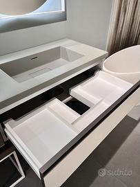 Questa composizione interpreta un nuovo concetto di arredobagno: destrutturata ma coerente, leggera alla vista ma solida alla struttura. L’effetto è elegante e contemporaneo, perfetto per ambienti sofisticati.