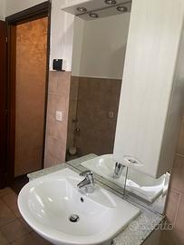 Mobile bagno sospeso composto da lavandino da semi incasso (marca Dolomite), specchiera, mobiletto a colonna laterale e miscelatore (marca Grohe).