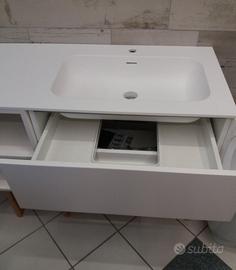 Mobile bagno sospeso con top in Tecnoril lavabo integrato (larghezza 59 cm profondità 32 cm, altezza 13 cm). Misure mobile larghezza 107 cm, profondità 51 cm altezza 52 cm composto da 1 base portalavabo cm 70 con due cassettoni a chiusura rallentata e vano a giorno cm 35. Presenta un piccolo difetto nell'angolo dx come da foto inclusa.