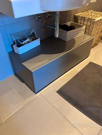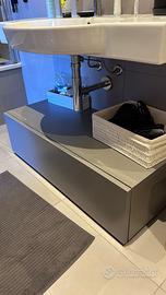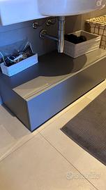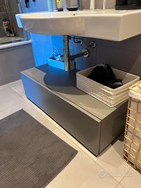 Mobile contenitore moderno color tortora opaco, posizionato sotto lavabo. Dotato di un ampio cassetto con apertura push-pull, perfetto per riporre asciugamani e prodotti bagno. Design lineare e pulito, in ottime condizioni.