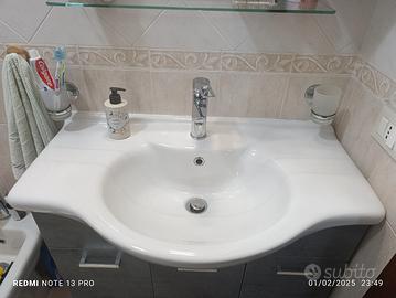 Il mobile color grigio cemento è composto da due ante centrali e due cassetti molto spaziosi al lato, un lavabo in ceramica, la specchiera e la lampada a LED.