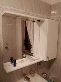 Mobile bagno a ripiani nella parte alta e doppio scomparto nella parte bassa ( uno scorrevole e uno fisso) oltre a specchio con mobiletto annesso.