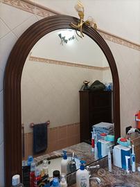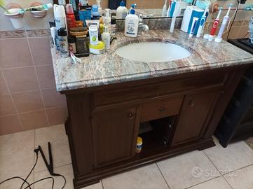 vendo mobile bagno in legno con bellissimo top in marmo con venature rosa. Manca lo sportello sottostante che un bravo falegname può rifare. Compreso anche lo specchio con cornice in legno e luci.