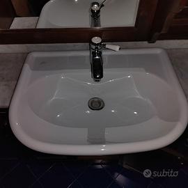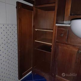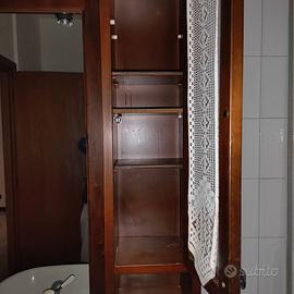 Vendo mobile bagno in legno scuro usato e comprensivo di: lavabo semincasso ideal standard, miscelatore 900 Zazzeri (con piletta), specchiera (con due punti luce, mensole ad antina vetrata), colonna in legno (a due ante di cui una vetrata) top ed alzatina di marmo grigio venato (no spedizione, da ritirare su Genova). Misure mobile con lavabo: altezza 80 cm, larghezza 32 cm, lunghezza 100 cm. Misure colonna: altezza 200 cm, larghezza 33 cm, lunghezza 32 cm.