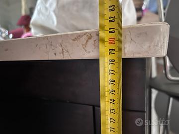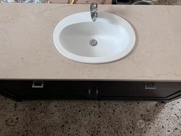 Vendo mobile bagno con top in marmo e lavandino,colore marrone venghe,cassettone grande sotto.Il mobile presenta una piccola ammaccatura su un angolo del marmo.